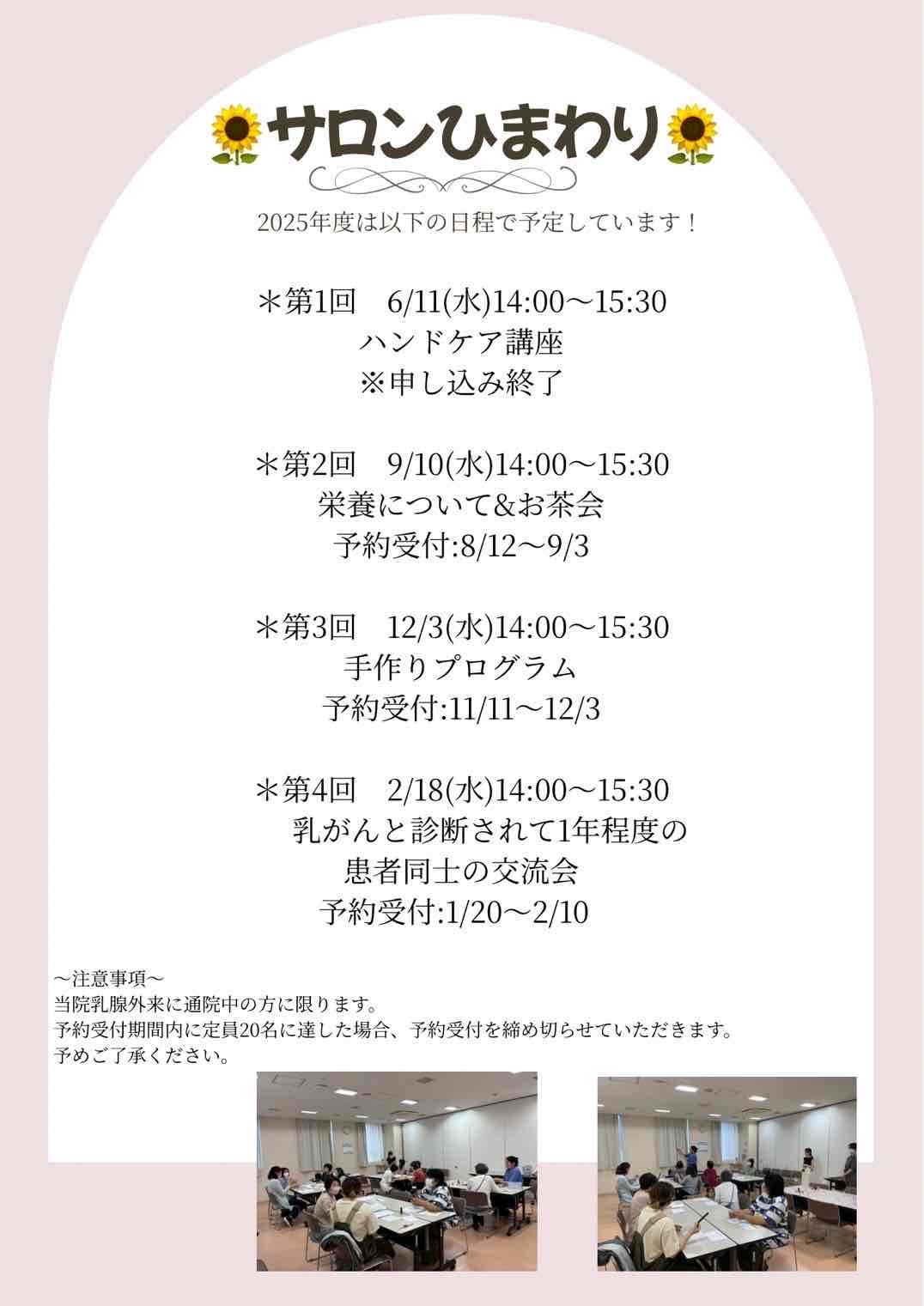 2024年度より患者主体の会から病院主体の会に生まれ変わりました。当院で乳がん治療されている患者さまを対象に年4回開催しています。是非ご参加お待ちしています。